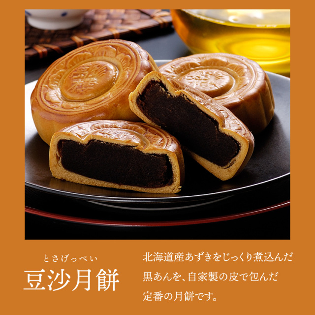 北海道産あずきをじっくり煮込んだ黒あんを自家製の皮で包んだ豆沙月餅と、