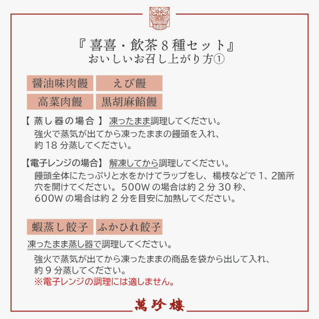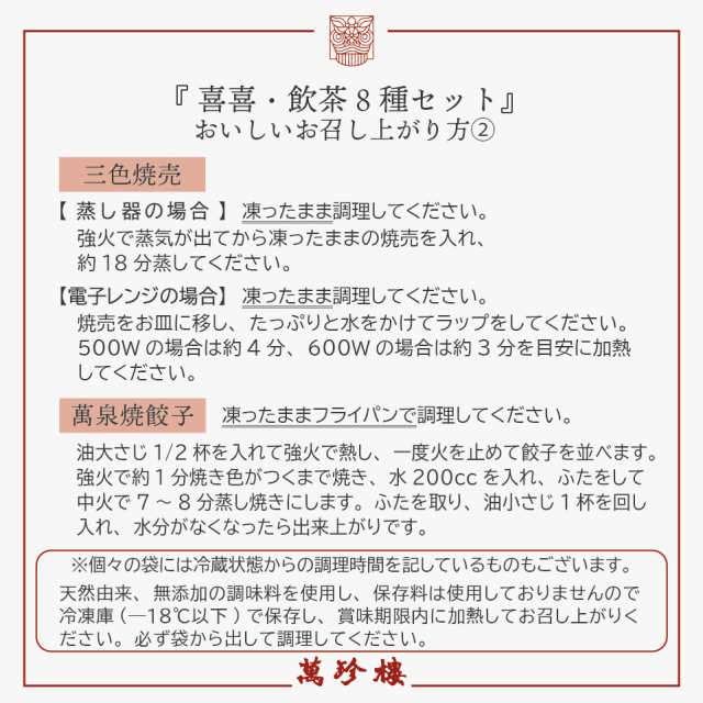 | 名称 | 萬泉焼餃子8個入 | ふかひれ餃子8個入 | 蝦蒸し餃子4個入 |